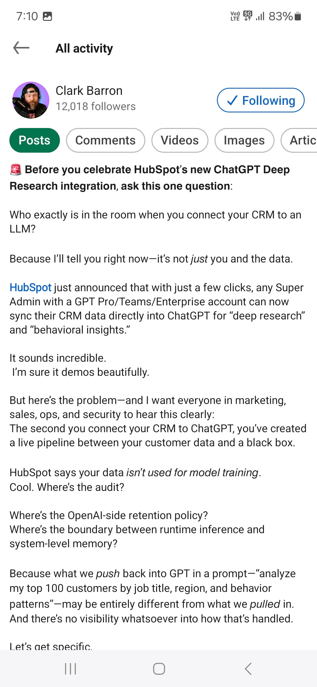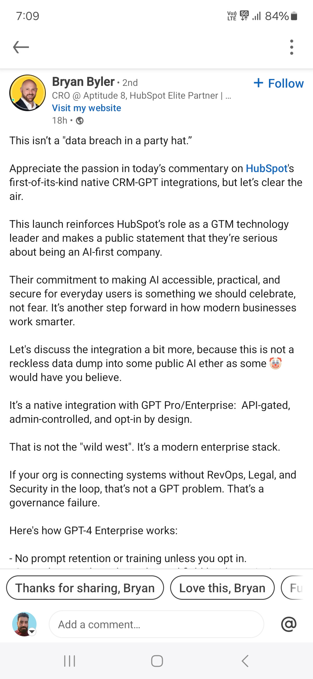 “If your org is connecting systems without RevOps, Legal, and Security in the loop, that’s not a GPT problem. That’s a governance failure.”
