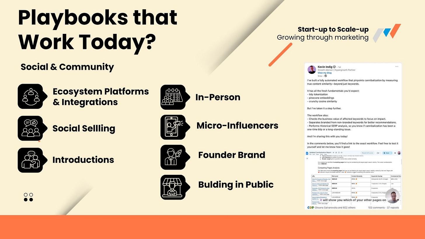 Most of the following plays overlap at multiple points. For example a founder brand is both a social selling play and a micro-influencer, while in-person events might lead to more introductions in the event.