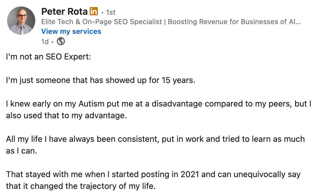 Showing up consistently builds a brand. Choosing a niche, a specialty, and an expertise around it. I was reading this post by Peter Rota the other day about showing up for 15 years to build his now 80k social media followership